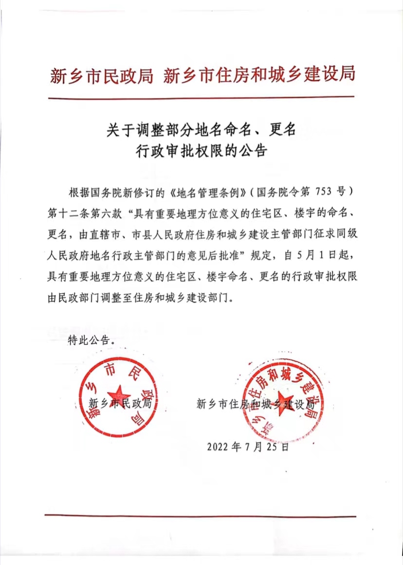 关于调整部分地名命名、更名行政审批权限的公告筑小讯2022年07月27日发布关注私信01244106 关于调整部分地名命名、更名行政审批权限的公告 文章来源于新乡市住建局,原文链接: 关于调整部分地名命名、更名行政审批权限的公告 © 版权声明本资讯不代表筑小讯的观点、立场,所涉信息、数据来源于省市部建委公开发布的信息或第三方,筑小讯不对其准确性、可靠性或完善性提供任何明示或暗示的保证,仅供参考。如果您认为本条资讯存在侵权或不妥之处,请通过官网客服或邮件(zxp@xddjob.com)与我们联系,我们将尽快删除或纠正。如因此给您带来不便,我们深表歉意,感谢您的理解和支持!THE END公示公告# 公告# 新乡市 此条有用,点赞收藏。如有疑问,相约评论区!点赞106打赏 分享QQ空间微博QQ好友海报分享复制链接收藏