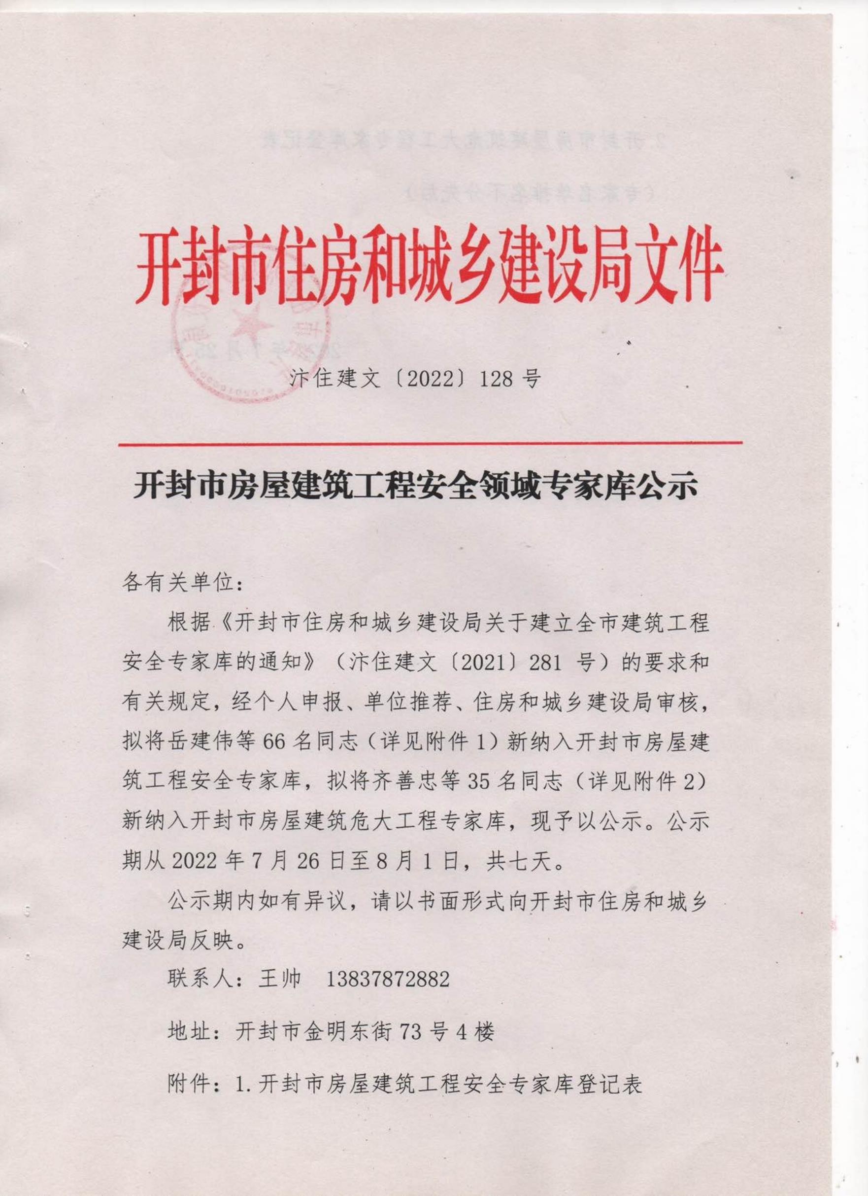根据《开封市住房和城乡建设局关于建立全市建筑工程 安全专家库的通知》(汴住建文(2021) 281号)的要求和有关规定,经个人申报、单位推荐、住房和城乡建设局审核,拟将岳建伟等66名同志(详见附件1)新纳入开封市房屋建筑工程安全专家库,拟将齐善忠等35名同志(详见附件2)新纳入开封市房屋建筑危大工程专家库,现予以公示。公示期从2022年7月26日至8月1日,共七天。