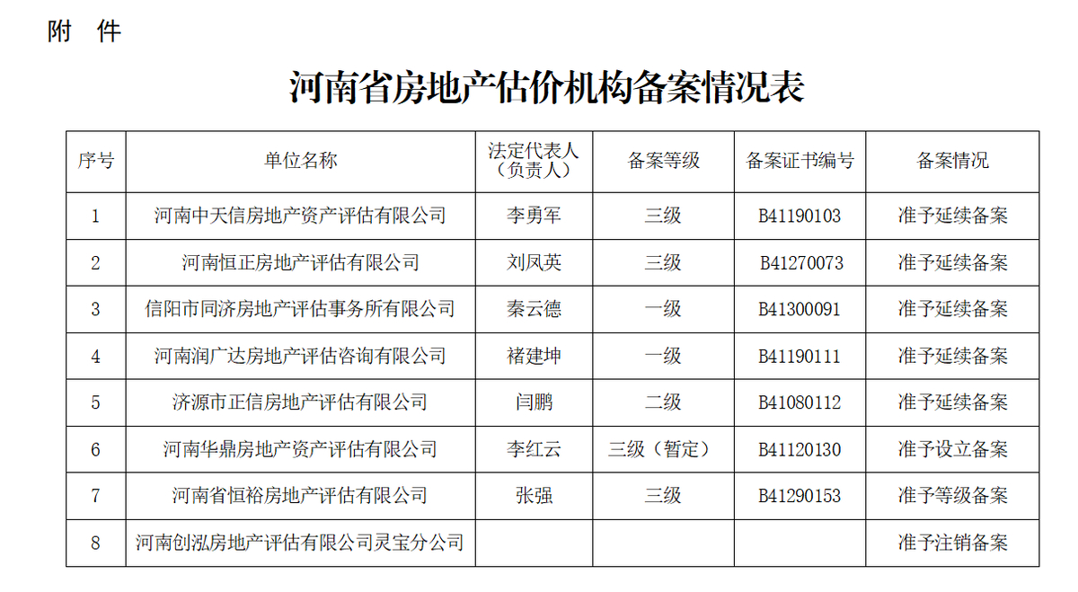 文章来源于河南省住建厅,原文链接: 河南省住房和城乡建设厅关于河南中天信房地产资产评估有限公司等8家房地产估价机构备案的公告
