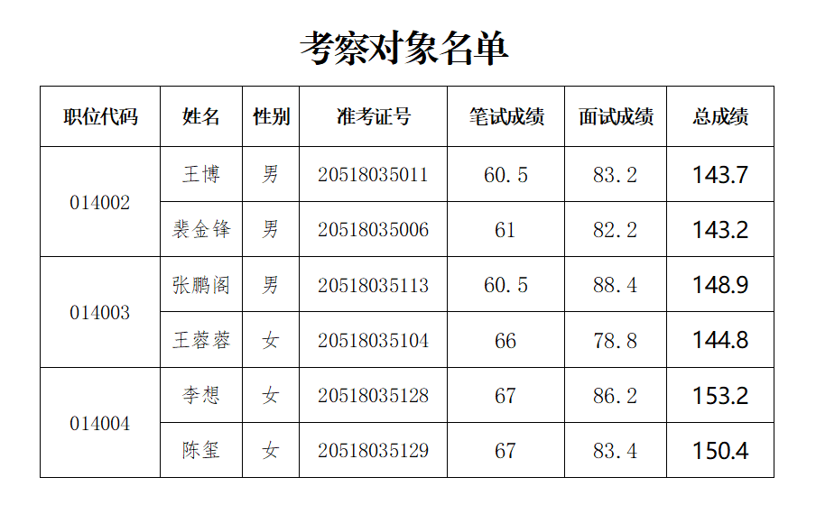 根据考试综合成绩由高分到低分的顺序,按照考察对象与拟录用人数1.5:1的比例(按四舍五入计算),确定考察对象(名单见附件)。