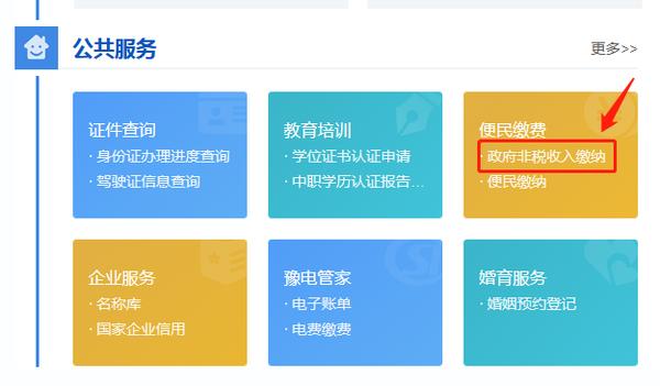 2.河南政务服务网首页“公共服务”一栏选择“便民缴费”“政府非税收入缴纳”。