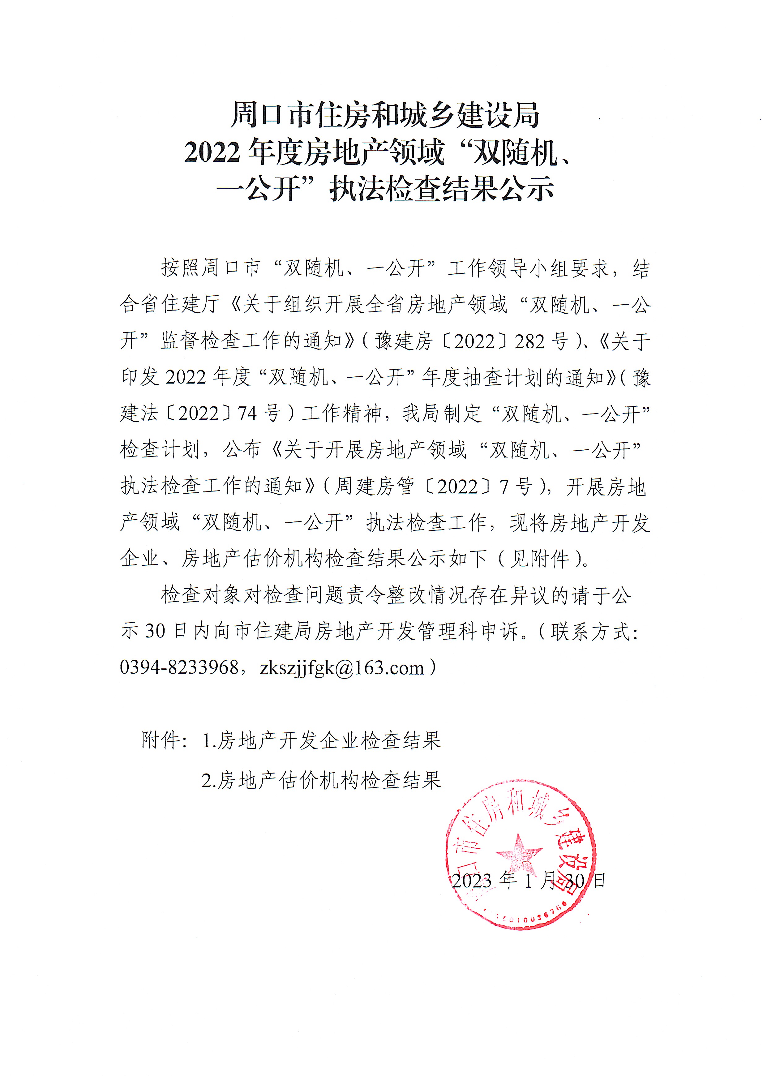 周口市住房和城乡建设局 2022年度房地产领域“双随机、 一公开”执法检查结果公示筑小讯2023年01月31日发布关注私信01410182 文章来源于周口市住建局,原文链接: 周口市住房和城乡建设局 2022年度房地产领域“双随机、 一公开”执法检查结果公示 © 版权声明本资讯不代表筑小讯的观点、立场,所涉信息、数据来源于省市部建委公开发布的信息或第三方,筑小讯不对其准确性、可靠性或完善性提供任何明示或暗示的保证,仅供参考。如果您认为本条资讯存在侵权或不妥之处,请通过官网客服或邮件(zxp@xddjob.com)与我们联系,我们将尽快删除或纠正。如因此给您带来不便,我们深表歉意,感谢您的理解和支持!THE END文件通知# 公示# 周口市# 周口市住建局 此条有用,点赞收藏。如有疑问,相约评论区!点赞182打赏 分享QQ空间微博QQ好友海报分享复制链接收藏