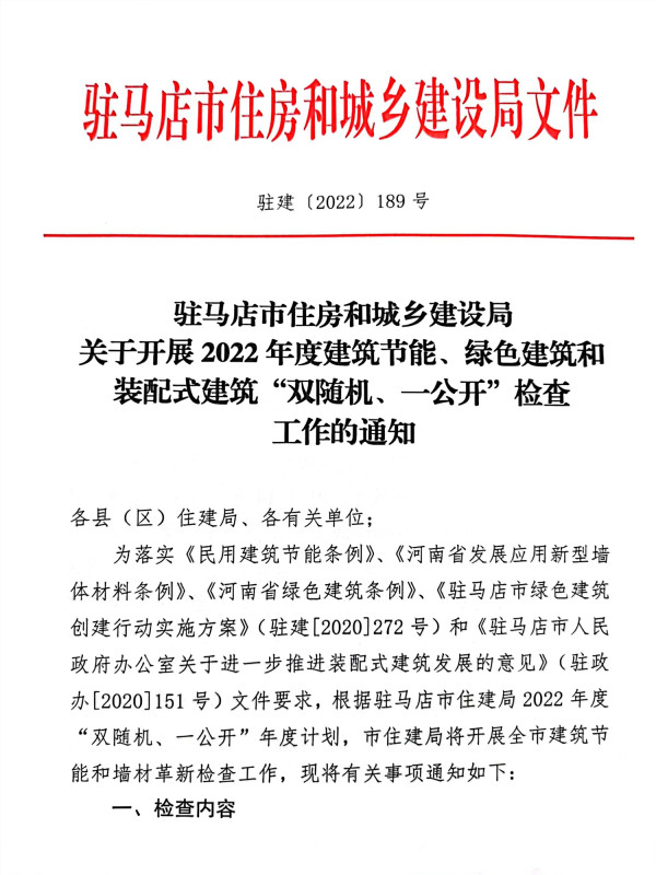驻马店市住房和城乡建设局关于开展2022年度建筑节能、绿色建筑和装配式建筑“双随机、一公开”工作的通知筑小讯2023年02月13日发布关注私信01619199 文章来源于驻马店市住建局,原文链接: 驻马店市住房和城乡建设局关于开展2022年度建筑节能、绿色建筑和装配式建筑“双随机、一公开”工作的通知 © 版权声明本资讯不代表筑小讯的观点、立场,所涉信息、数据来源于省市部建委公开发布的信息或第三方,筑小讯不对其准确性、可靠性或完善性提供任何明示或暗示的保证,仅供参考。如果您认为本条资讯存在侵权或不妥之处,请通过官网客服或邮件(zxp@xddjob.com)与我们联系,我们将尽快删除或纠正。如因此给您带来不便,我们深表歉意,感谢您的理解和支持!THE END文件通知# 通知# 驻马店市 此条有用,点赞收藏。如有疑问,相约评论区!点赞199打赏 分享QQ空间微博QQ好友海报分享复制链接收藏