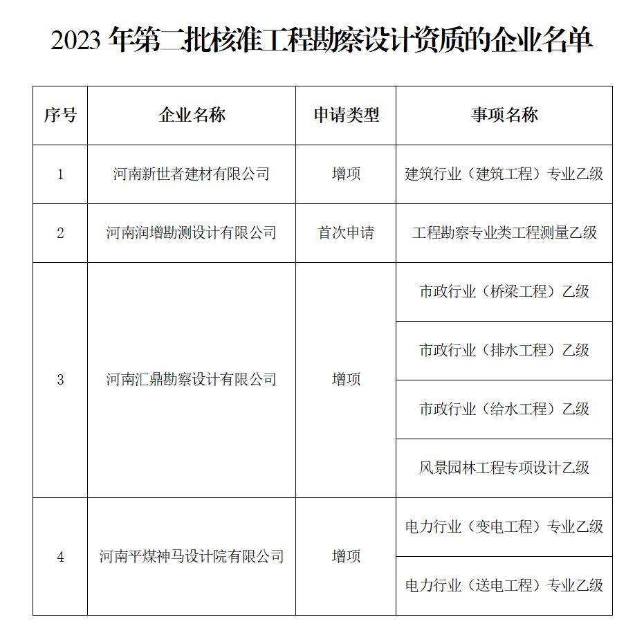 根据《中华人民共和国建筑法》及建设部《建设工程勘察设计资质管理规定》(建设部令第160号)和《工程设计资质标准》(建市〔2007〕86号)、住房城乡建设部《工程勘察资质标准》(建市〔2013〕9号)等有关规定,我厅组织对企业资质申报材料进行了审查。现同意2023年第二批“河南新世者建材有限公司”等4家工程勘察设计企业资质核准申请。