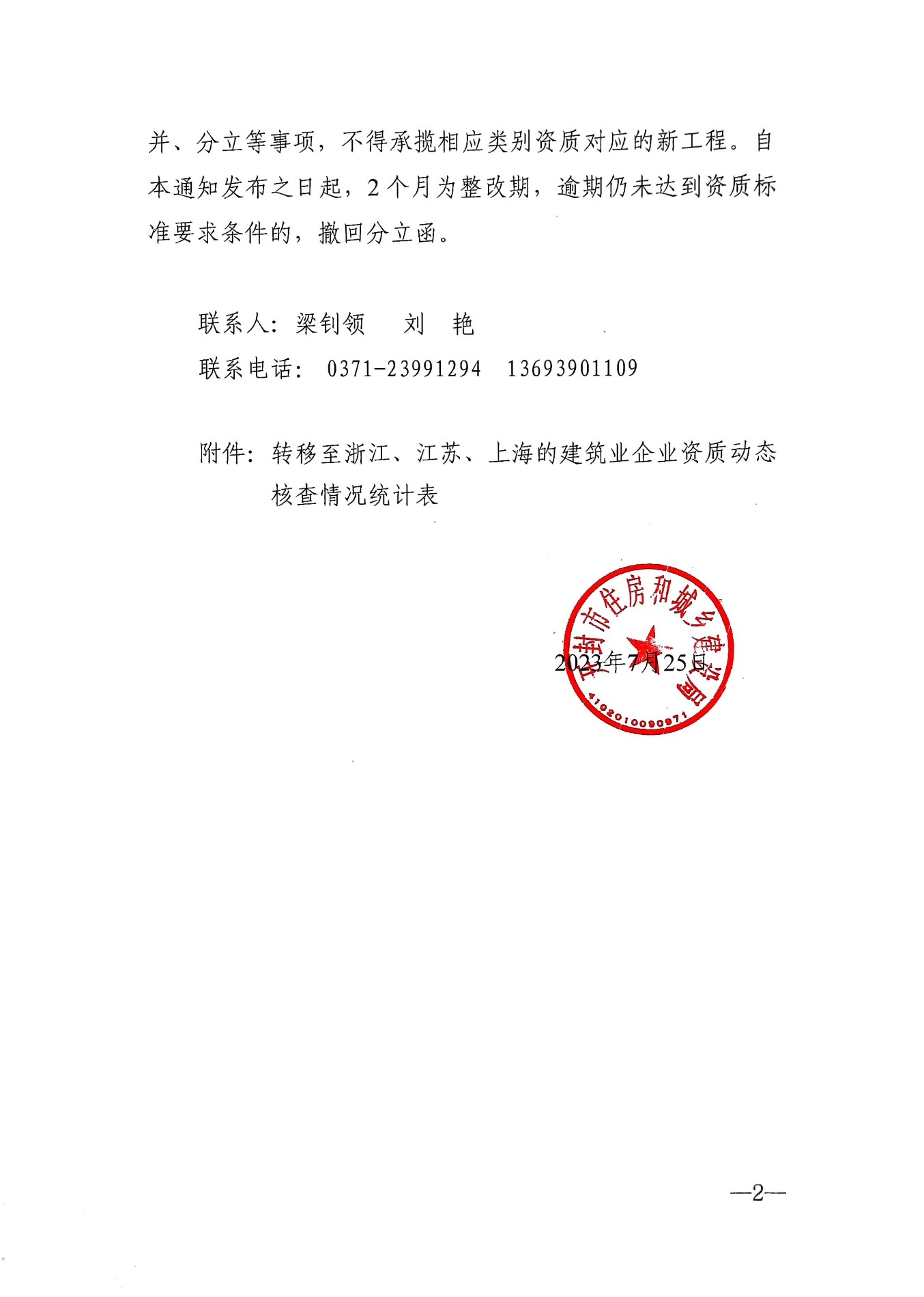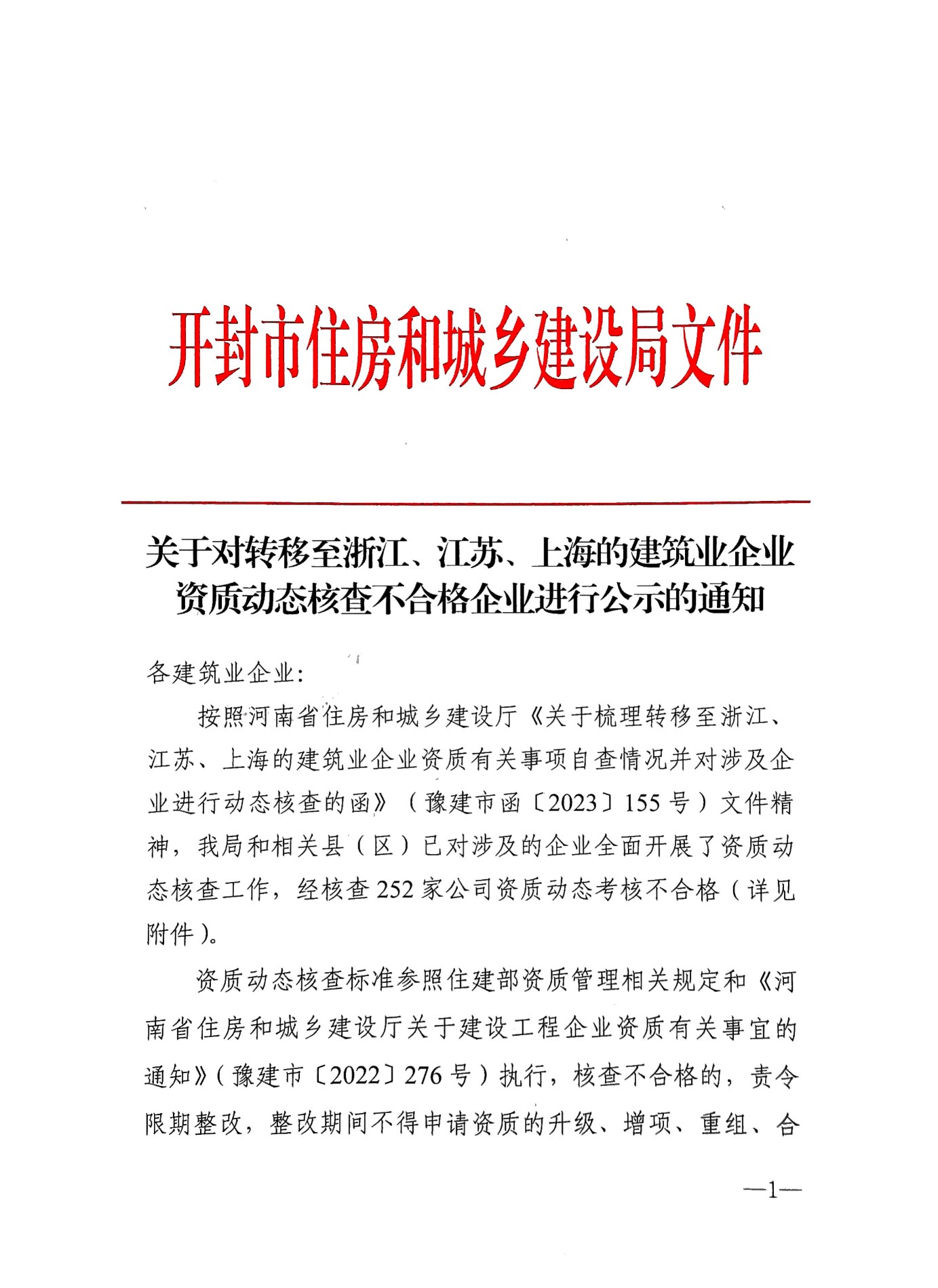 关于对转移至浙江、江苏、上海的建筑业企业资质动态核查不合格企业进行公示的通知筑小讯2023年07月25日发布关注私信01159250 附件 转移至浙江、江苏、上海的建筑业企业资质动态核查情况统计表.pdf 文章来源于开封市住建局,原文链接: 关于对转移至浙江、江苏、上海的建筑业企业资质动态核查不合格企业进行公示的通知 © 版权声明本资讯不代表筑小讯的观点、立场,所涉信息、数据来源于省市部建委公开发布的信息或第三方,筑小讯不对其准确性、可靠性或完善性提供任何明示或暗示的保证,仅供参考。如果您认为本条资讯存在侵权或不妥之处,请通过官网客服或邮件(zxp@xddjob.com)与我们联系,我们将尽快删除或纠正。如因此给您带来不便,我们深表歉意,感谢您的理解和支持!THE END公示公告# 通知# 公示# 开封市 此条有用,点赞收藏。如有疑问,相约评论区!点赞250打赏 分享QQ空间微博QQ好友海报分享复制链接收藏