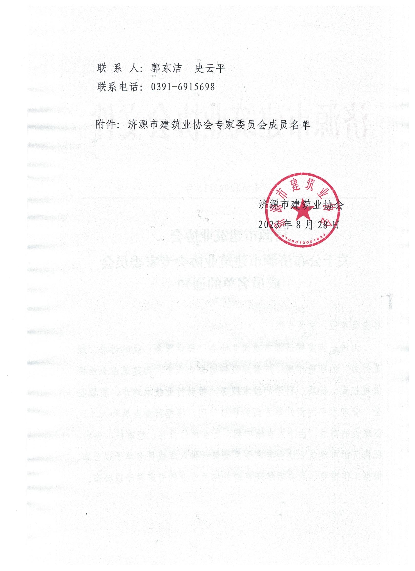 关于公布济源市建筑业协会专家委员会成员名单的通知筑小讯2023年09月07日发布关注私信02584256 文章来源于济源产城融合示范区住建局 : 关于公布济源市建筑业协会专家委员会成员名单的通知 © 版权声明本资讯不代表筑小讯的观点、立场,所涉信息、数据来源于省市部建委公开发布的信息或第三方,筑小讯不对其准确性、可靠性或完善性提供任何明示或暗示的保证,仅供参考。如果您认为本条资讯存在侵权或不妥之处,请通过官网客服或邮件(zxp@xddjob.com)与我们联系,我们将尽快删除或纠正。如因此给您带来不便,我们深表歉意,感谢您的理解和支持!THE END公示公告文件通知# 通知# 济源市 此条有用,点赞收藏。如有疑问,相约评论区!点赞256打赏 分享QQ空间微博QQ好友海报分享复制链接收藏