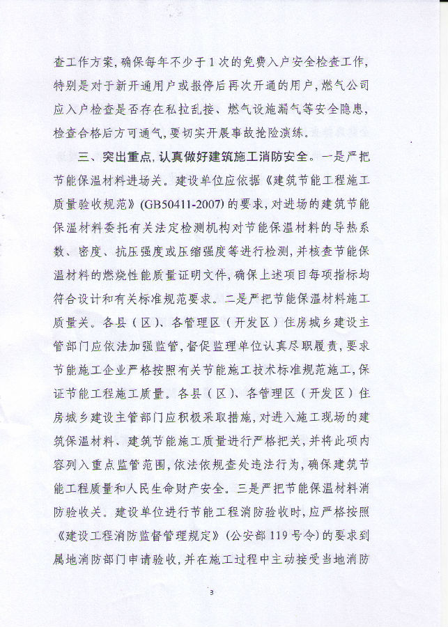 三、突出重点,认真做好建筑施工消防安全。一是严把节能保温材料进场关。建设单位应依据《建筑节能工程施工质量验收规范》(GB50411-2007)的要求,对进场的建筑节能保温材料委托有关法定检测机构对节能保温材料的导热系数、密度、抗压强度或压缩强度等进行检测,并核查节能保温材料的燃烧性能质量证明文件,确保上述项目每项指标均符合设计和有关标准规范要求。二是严把节能保温材料施工质量关。各县(区)、各管理区(开发区)住房城乡建设主管部门应依法加强监管,督促监理单位认真尽职履责,要求节能施工企业严格按照有关节能施工技术标准规范施工,保证节能工程施工质量。各县(区)、各管理区(开发区)住房城乡建设主管部门应积极采取措施,对进入施工现场的建筑保温材料、建筑节能施工质量进行严格把关,并将此项内容列入重点监管范围,依法依规查处违法行为,确保建筑节能工程质量和人民生命财产安全。三是严把节能保温材料消防验收关。建设单位进行节能工程消防验收时,应严格按照《建设工程消防监督管理规定》(公安部119号令)的要求到属地消防部门申请验收,并在施工过程中主动接受当地消防部门的监督管理。四是强化施工现场消防安全监管。各县(区)、各管理区(开发区)要按照《住房城乡建设系统今冬明春火灾防控工作方案》要求,加强建筑施工现场消防安全隐患排查治理,要把是否制定消防责任制度、消防器材是否齐全、消防设施是否完善、动火作业是否审批等作为现场消防检查重点内容,督促施工单位制定用火、用电、使用易然易爆材料等各项消防安全管理制度和操作规程,严格按规定设置消防通道、消防水源,特别是对施工现场明火作业、外墙保温施工、施工人员集体宿合用火用电设施、易燃易爆材料管理等消防安全关键环节和部位进行重点监控,督促施工单位切实做好施工现场消防安全管理工作。