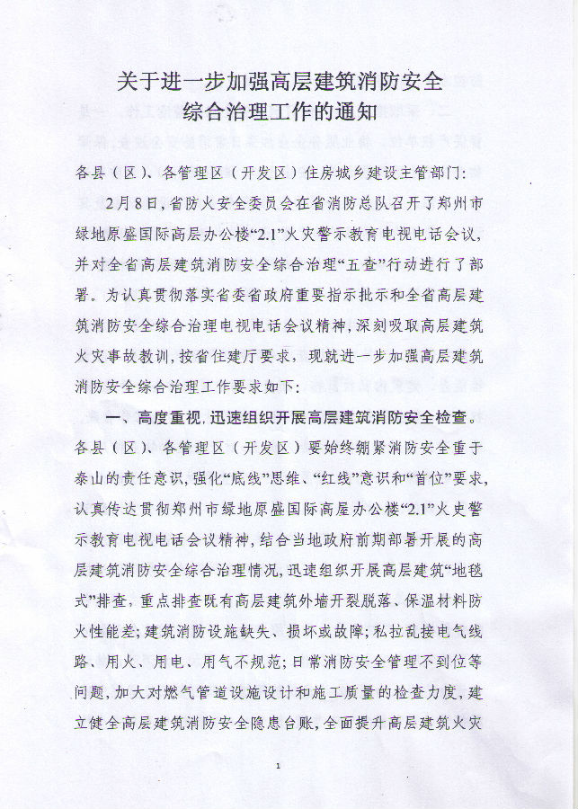 2月8日,省防火安全委员会在省消防总队召开了郑州市绿地原盛国际高层办公楼“2.1”火灾警示教育电视电话会议,并对全省高层建筑消防安全综合治理“五查”行动进行了部署。为认真贯彻落实省委省政府重要指示批示和全省高层建筑消防安全综合治理电视电话会议精神,深刻吸取高层建筑火灾事故教训,按省住建厅要求,现就进一步加强高层建筑消防安全综合治理工作要求如下: