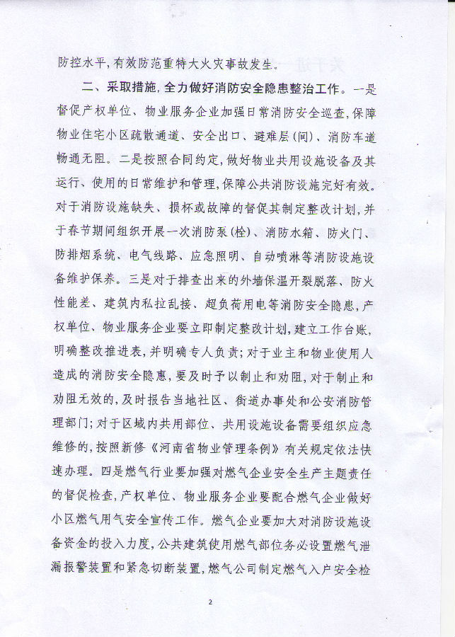 二、采取措施,全力做好消防安全隐患整治工作。一是督促产权单位、物业服务企业加强日常消防安全巡查,保障物业住宅小区疏散通道、安全出口、避难层(间)、消防车道畅通无阻。二是按照合同约定,做好物业共用设施设备及其运行、使用的日常维护和管理,保障公共消防设施完好有效。对于消防设施缺失、损杯或故障的督促其制定整改计划,并于春节期间组织开展一次消防泵(栓)、消防水箱、防火门、防排烟系统、电气线路、应急照明、自动喷淋等消防设施设备维护保养。三是对于排查出来的外墙保温开裂脱落、防火性能差、建筑内私拉乱接、超负荷用电等消防安全隐患,产权单位、物业服务企业要立即制定整改计划,建立工作台账,明确整改推进表,并明确专人负责;对于业主和物业使用人造成的消防安全隐惠,要及时予以制止和劝阻,对于制止和劝阻无效的,及时报告当地社区、街道办事处和公安消防管理部门;对于区域内共用部位、共用设施设备需要组织应急维修的,按照新修《河南省物业管理条例》有关规定依法快速办理。四是燃气行业要加强对燃气企业安全生产主体责任的督促检查,产权单位、物业服务企业要配合燃气企业做好小区燃气用气安全宣传工作。燃气企业要加大对消防设施设备资金的投入力度,公共建筑使用燃气部位务必设置燃气泄漏报警装置和紧急切断装置,燃气公司制定燃气入户安全检查工作方案,确保每年不少于1次的免费入户安全检查工作,特别是对于新开通用户或报停后再次开通的用户,燃气公司应入户检查是否存在私拉乱接、燃气设施漏气等安全隐患,检查合格后方可通气,要切实开展事故抢险演练。