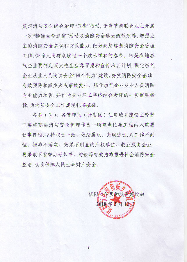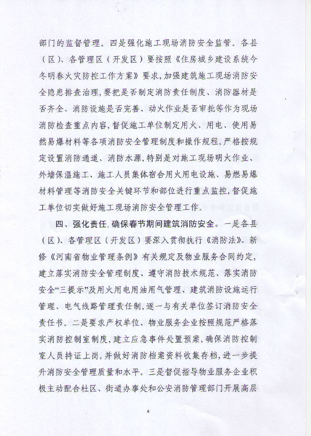 四、强化责任,确保春节期间建筑消防安全。一是各县(区)、各管理区(开发区)要深入贯彻执行《消防法》、新修《河南省物业管理条例》有关规定及物业服务合同约定,建立落实消防安全管理制度、遵守消防技术规范、落实消防安全“三提示”及用火用电用油用气管理、建筑消防设施运行管理、电气线路管理责任制,逐一与有关单位签订消防安全责任书。二是要求产权单位、物业服务企业按照规范严格落实消防控制室制度,建立应急事件处置预案,确保消防控制室人员持证上岗,并做好消防档案资料收集存档,进一步提升消防安全管理质量和水平。三是督促指导物业服务企业积极主动配合杜区、街道办事处和公安消防管理部门开展高层建筑消防安全综合治理“五查”行动,于春节前联合业主开展一次“畅通生命通道”活动及消防安全逃生疏散演练,增强业主的消防安全意识和防范能力,做好高层建筑消防安全管理工作,保障人民群众度过一个欢乐祥和的春节。四是各地燃气企业要制定灭火逃生应急预案和宣传培训计划,强化燃气企业从业人员消防安全“四个能力”建设,夯实消防安全基础,有效预防和减少火灾事故发生。强化燃气企业从业人员消防专业能力培训,并作为企业职工年终综合考评的一项重要指标,为消防安全工作奠定扎实基础。