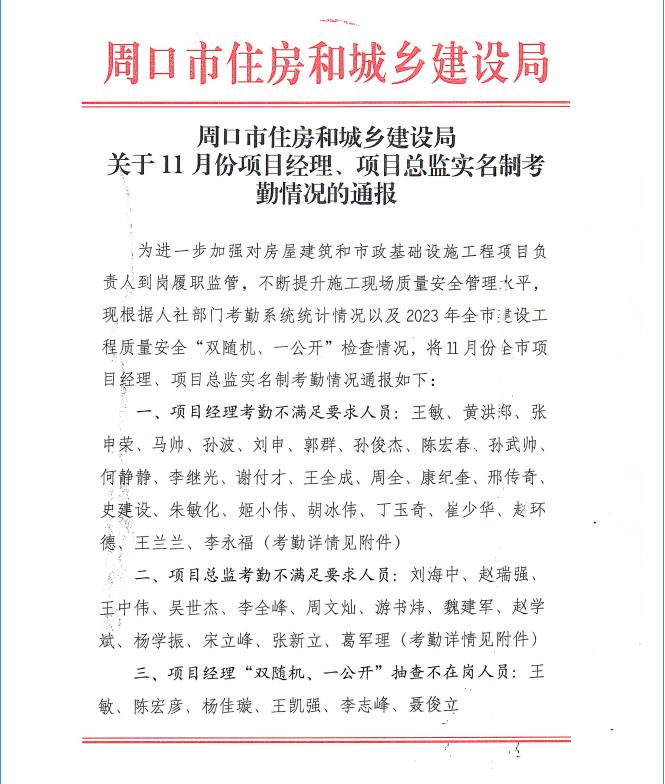 11月份项目经理、项目总监考勤通报筑小讯2023年12月18日发布关注私信0194107 11月项目经理、总监实名制考勤通报.pdf 文章来源于周口市住建局,原文链接: 11月份项目经理、项目总监考勤通报 © 版权声明本资讯不代表筑小讯的观点、立场,所涉信息、数据来源于省市部建委公开发布的信息或第三方,筑小讯不对其准确性、可靠性或完善性提供任何明示或暗示的保证,仅供参考。如果您认为本条资讯存在侵权或不妥之处,请通过官网客服或邮件(zxp@xddjob.com)与我们联系,我们将尽快删除或纠正。如因此给您带来不便,我们深表歉意,感谢您的理解和支持!THE END公示公告# 项目# 周口市# 周口市住建局 此条有用,点赞收藏。如有疑问,相约评论区!点赞107打赏 分享QQ空间微博QQ好友海报分享复制链接收藏