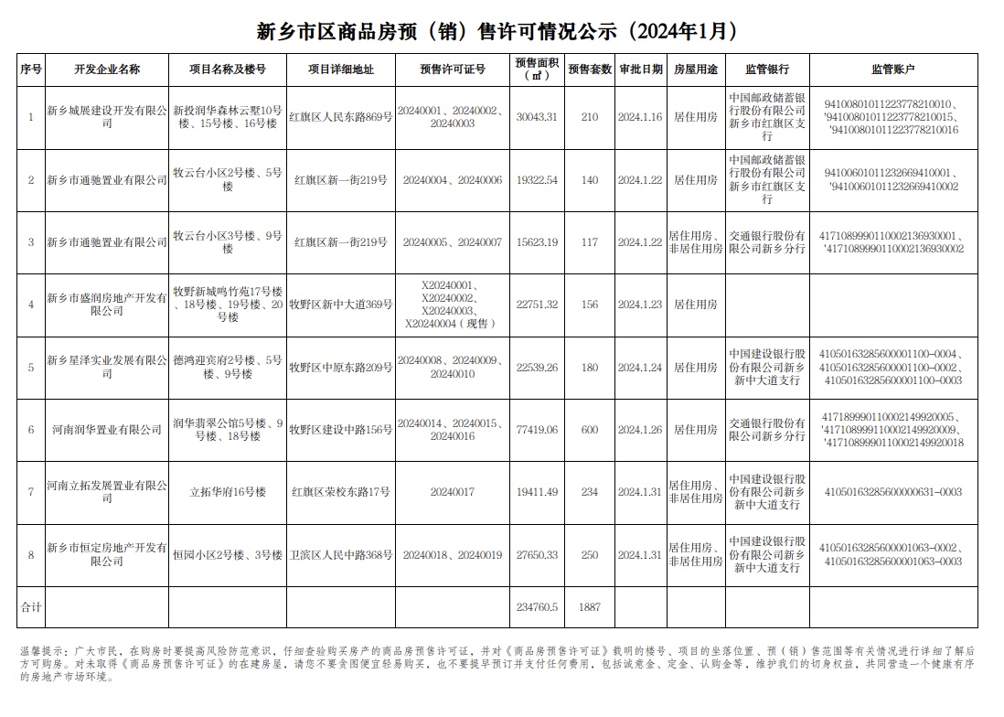 新乡市区商品房预(销)售许可情况公示(2024年1月)筑小讯2024年02月01日发布关注私信02845161 文章来源于新乡市住建局,原文链接: 新乡市区商品房预(销)售许可情况公示(2024年1月) © 版权声明本资讯不代表筑小讯的观点、立场,所涉信息、数据来源于省市部建委公开发布的信息或第三方,筑小讯不对其准确性、可靠性或完善性提供任何明示或暗示的保证,仅供参考。如果您认为本条资讯存在侵权或不妥之处,请通过官网客服或邮件(zxp@xddjob.com)与我们联系,我们将尽快删除或纠正。如因此给您带来不便,我们深表歉意,感谢您的理解和支持!THE END公示公告# 公示# 新乡市 此条有用,点赞收藏。如有疑问,相约评论区!点赞161打赏 分享QQ空间微博QQ好友海报分享复制链接收藏