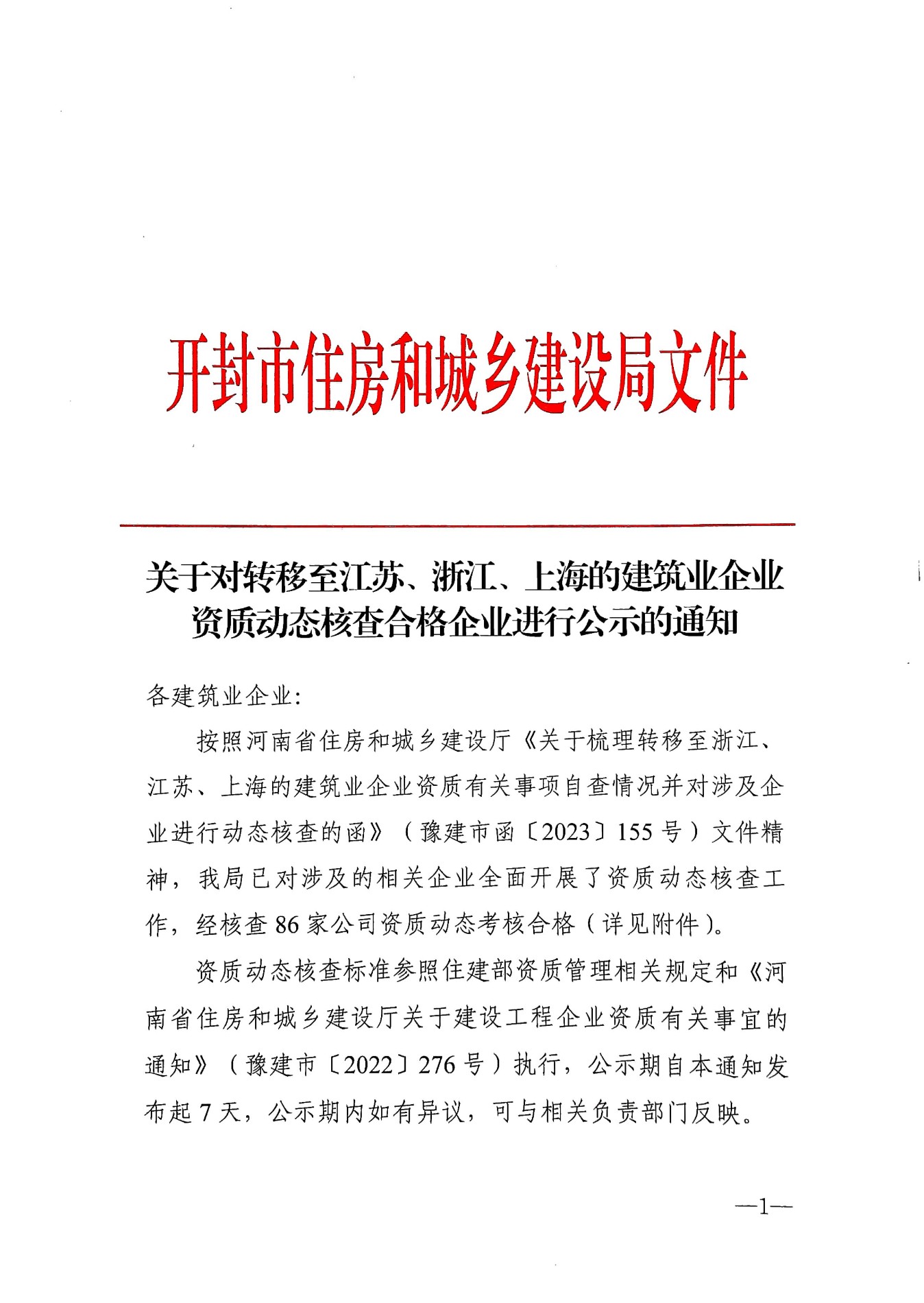 关于对转移至江苏、浙江、上海的建筑业企业资质动态核查合格企业进行公示的通知筑小讯2024年03月26日发布关注私信01088207 附件 转移至江苏、浙江、上海的建筑业企业资质动态核查情况统计表.pdf 文章来源于开封市住建局,原文链接: 关于对转移至江苏、浙江、上海的建筑业企业资质动态核查合格企业进行公示的通知 © 版权声明本资讯不代表筑小讯的观点、立场,所涉信息、数据来源于省市部建委公开发布的信息或第三方,筑小讯不对其准确性、可靠性或完善性提供任何明示或暗示的保证,仅供参考。如果您认为本条资讯存在侵权或不妥之处,请通过官网客服或邮件(zxp@xddjob.com)与我们联系,我们将尽快删除或纠正。如因此给您带来不便,我们深表歉意,感谢您的理解和支持!THE END公示公告# 通知# 公示# 开封市 此条有用,点赞收藏。如有疑问,相约评论区!点赞207打赏 分享QQ空间微博QQ好友海报分享复制链接收藏