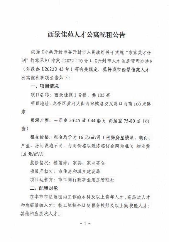 依据《中共开封市委开封市人民政府关于实施“东京英才计划”的意见》(汴发〔2022〕10号)、《开封市人才住房管理办法》(汴政办〔2022〕43号)等有关规定,现将我市西景佳苑人才公寓配租事项公告如下: