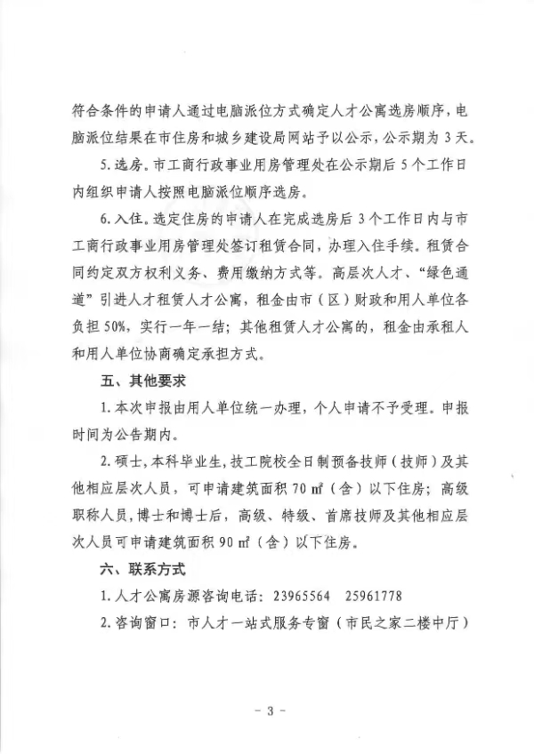 4.派位。按照“高端优先、统筹兼顾、分类施策、逐步解决”的原则,市住房和城乡建设局指导市工商行政事业用房管理处对符合条件的申请人通过电脑派位方式确定人才公寓选房顺序,电脑派位结果在市住房和城乡建设局网站予以公示,公示期为3天。