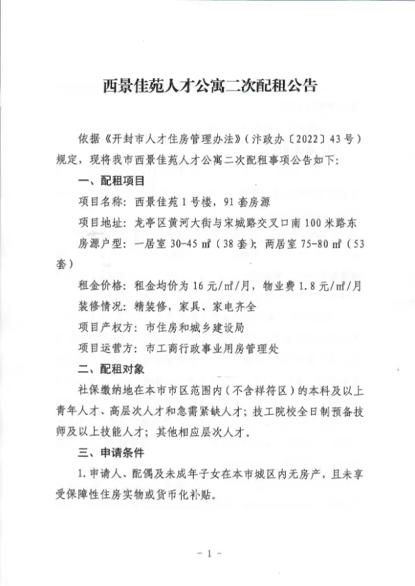 文章来源于开封市住建局,原文链接: 西景佳苑人才公寓二次配租公告