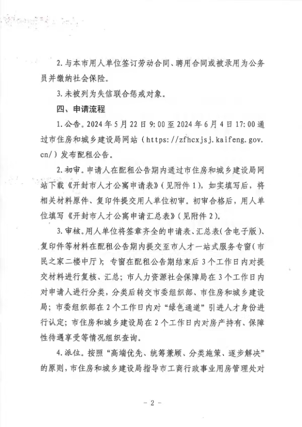 1.公告。2024年5月22日9:00至2024年6月4日17:00通过市住房和城乡建设局网站(https://zfhcxjsj.kaifeng.gov.cn/)发布配租公告。