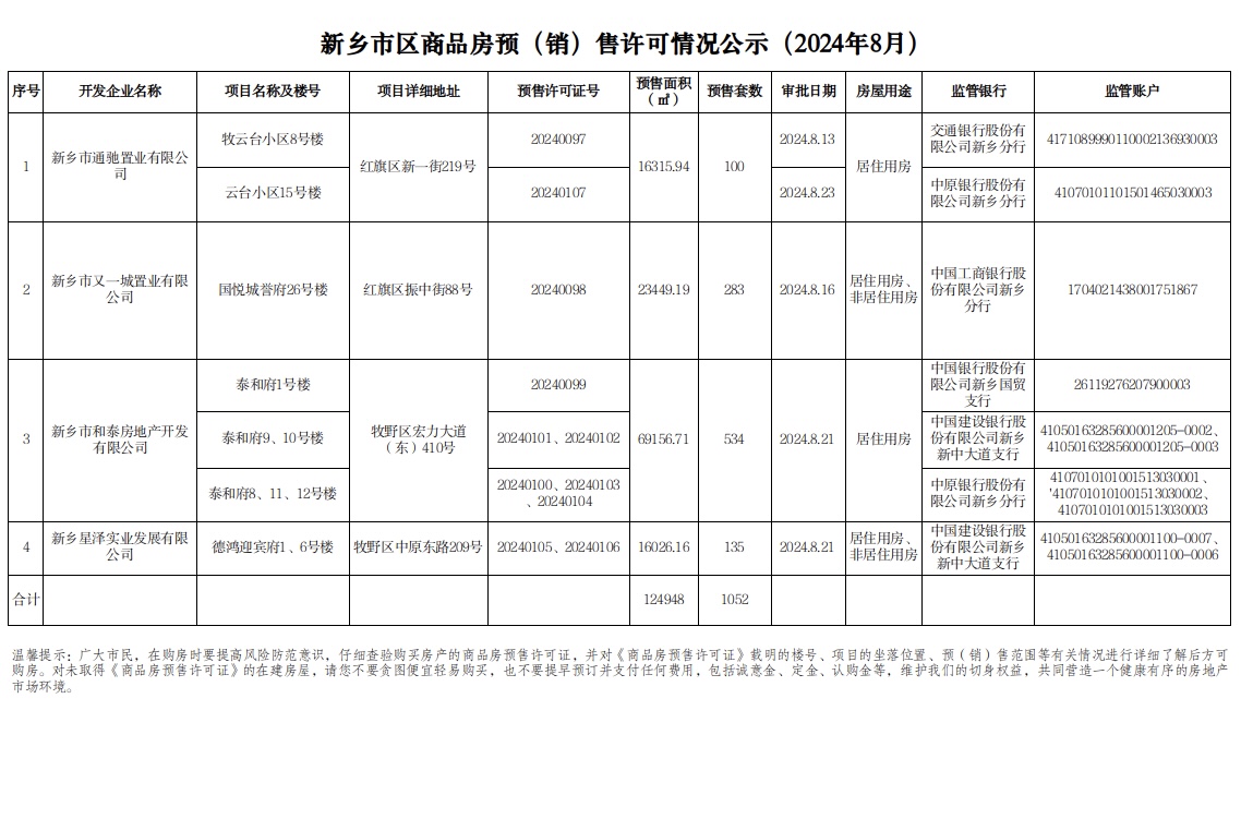新乡市区商品房预(销)售许可情况公示(2024年8月)筑小讯2024年09月02日发布关注私信02061193 文章来源于新乡市住建局,原文链接: 新乡市区商品房预(销)售许可情况公示(2024年8月) © 版权声明本资讯不代表筑小讯的观点、立场,所涉信息、数据来源于省市部建委公开发布的信息或第三方,筑小讯不对其准确性、可靠性或完善性提供任何明示或暗示的保证,仅供参考。如果您认为本条资讯存在侵权或不妥之处,请通过官网客服或邮件(zxp@xddjob.com)与我们联系,我们将尽快删除或纠正。如因此给您带来不便,我们深表歉意,感谢您的理解和支持!THE END公示公告# 公示# 新乡市 此条有用,点赞收藏。如有疑问,相约评论区!点赞193打赏 分享QQ空间微博QQ好友海报分享复制链接收藏