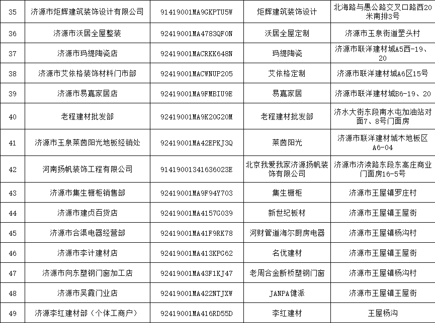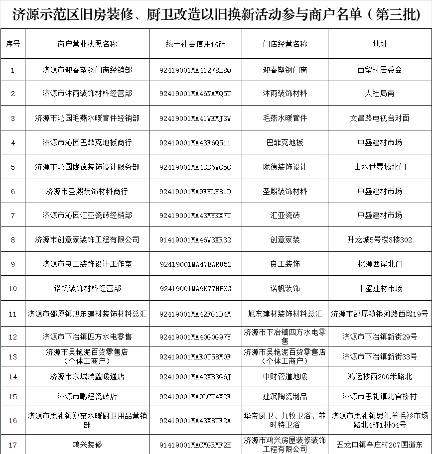 现将济源示范区旧房装修、厨卫改造以旧换新活动49户参与商户名单(第三批)予以公布。