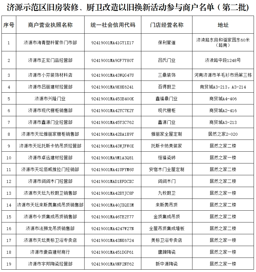文章来源于济源产城融合示范区住建局 : 关于公布济源示范区旧房装修、厨卫改造以旧换新活动参与商家名单(第二批)的公告