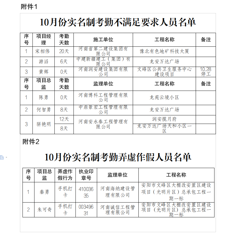 文章来源于安阳市住建局,原文链接: 安阳市住房和城乡建设局 关于10月份项目经理、项目总监实名制考勤情况的通报