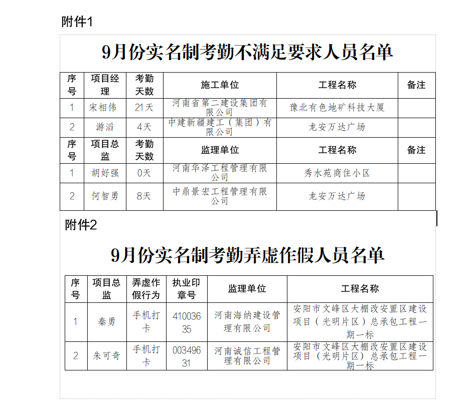 文章来源于安阳市住建局,原文链接: 安阳市住房和城乡建设局 关于9月份项目经理、项目总监实名制考勤情况的通 报