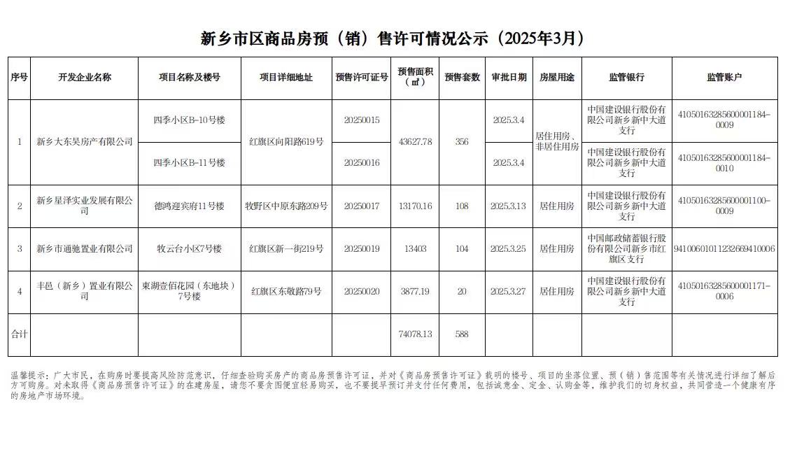 新乡市区商品房预(销)售许可情况公示(2025年3月)筑小讯2025年04月01日发布关注私信01554263 文章来源于新乡市住建局,原文链接: 新乡市区商品房预(销)售许可情况公示(2025年3月) © 版权声明本资讯不代表筑小讯的观点、立场,所涉信息、数据来源于省市部建委公开发布的信息或第三方,筑小讯不对其准确性、可靠性或完善性提供任何明示或暗示的保证,仅供参考。如果您认为本条资讯存在侵权或不妥之处,请通过官网客服或邮件(zxp@xddjob.com)与我们联系,我们将尽快删除或纠正。如因此给您带来不便,我们深表歉意,感谢您的理解和支持!THE END公示公告# 公示# 新乡市 此条有用,点赞收藏。如有疑问,相约评论区!点赞263打赏 分享QQ空间微博QQ好友海报分享复制链接收藏