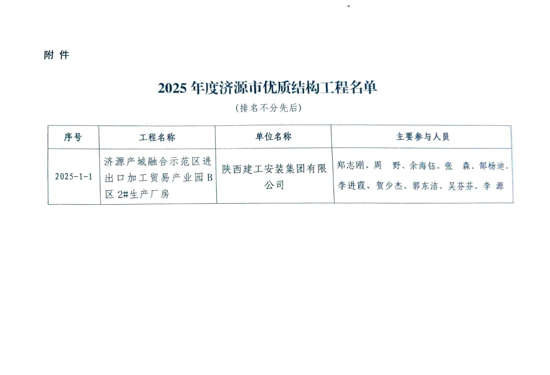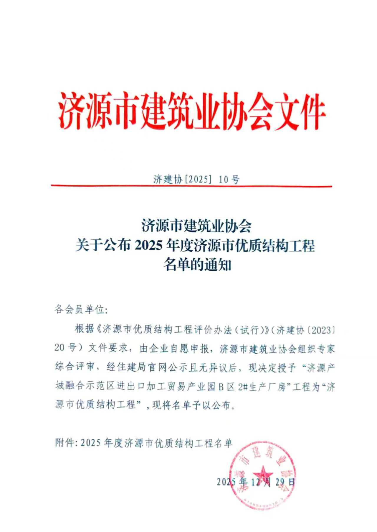 关于公布2025年度济源市优质结构工程名单的通知筑小讯2025年12月31日发布关注私信012865 文章来源于济源产城融合示范区住建局 : 关于公布2025年度济源市优质结构工程名单的通知 © 版权声明本资讯不代表筑小讯的观点、立场,所涉信息、数据来源于省市部建委公开发布的信息或第三方,筑小讯不对其准确性、可靠性或完善性提供任何明示或暗示的保证,仅供参考。如果您认为本条资讯存在侵权或不妥之处,请通过官网客服或邮件(zxp@xddjob.com)与我们联系,我们将尽快删除或纠正。如因此给您带来不便,我们深表歉意,感谢您的理解和支持!THE END公示公告文件通知# 通知# 济源市 此条有用,点赞收藏。如有疑问,相约评论区!点赞5打赏 分享QQ空间微博QQ好友海报分享复制链接收藏
