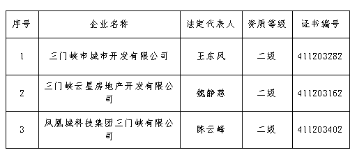 文章来源于三门峡市住建局,原文链接: 三门峡市住房和城乡建设局 关于2026年第二批三门峡市城市开发 有限公司等三家房地产开发企业资质 核定结果的公告