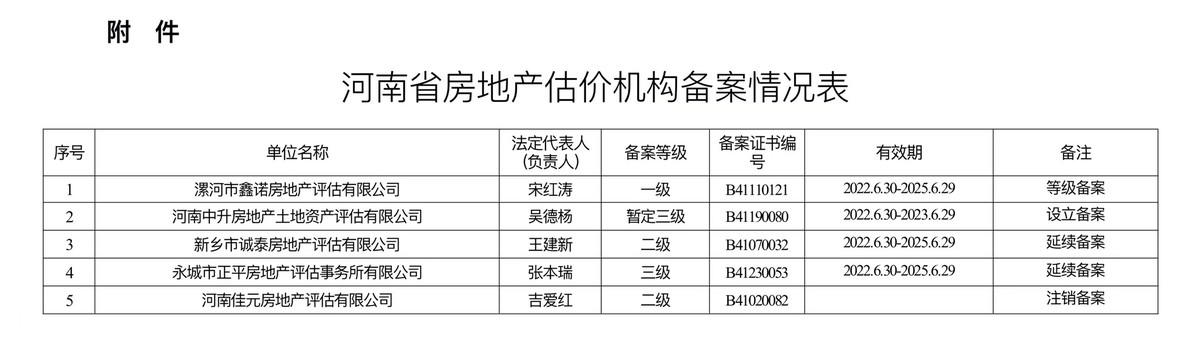 根据《中华人民共和国资产评估法》《房地产估价机构管理办法》(住建部令第24号)《关于贯彻落实资产评估法规范房地产估价行业管理有关问题的通知》(建房〔2016〕275号)及我省房地产估价机构备案的有关规定,现将漯河市鑫诺房地产评估有限公司等5家房地产估价机构备案情况予以公布。